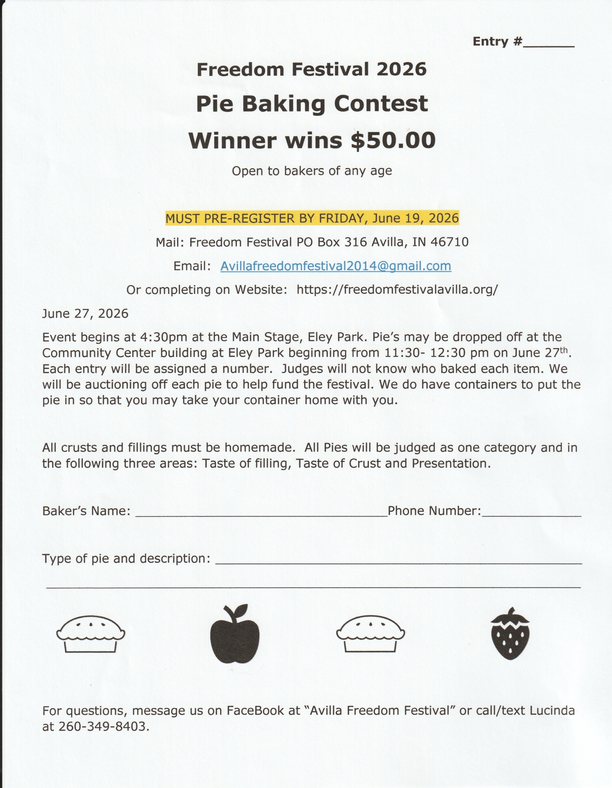 Freedom Festival 2026 is Thursday, June 25th through Saturday, June 27th at Eley Memorial Park, on West Albion Street in Avilla.